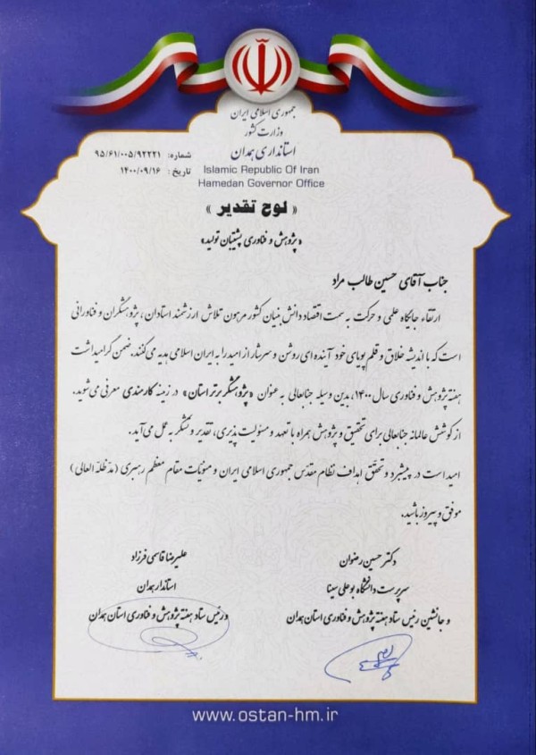 در بخشی از این تقدیر نامه آمده است : ارتقاِ جایگاه علمی و حرکت به سمت اقتصاد دانش بنیان کشور مرهون تلاش ارزشمند استادان، پژوهشگران و فناورانی است که با اندیشه خلاق و قلم پویای خود آینده ای روشن وسرشار از امید را به ایران اسلامی هدیه می کند.