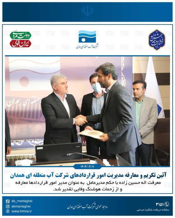 به گزارش روابط عمومی شرکت آب منطقه ای همدان، طی حکمی از سوی دکتر رضا اخلاص مند مدیر عامل شرکت آب منطقه ای همدان، معرفت اله حسین زاده، به سرپرست مدیریت قراردادها منصوب و از زحمات دکتر هوشنگ وفایی تقدیر شد.